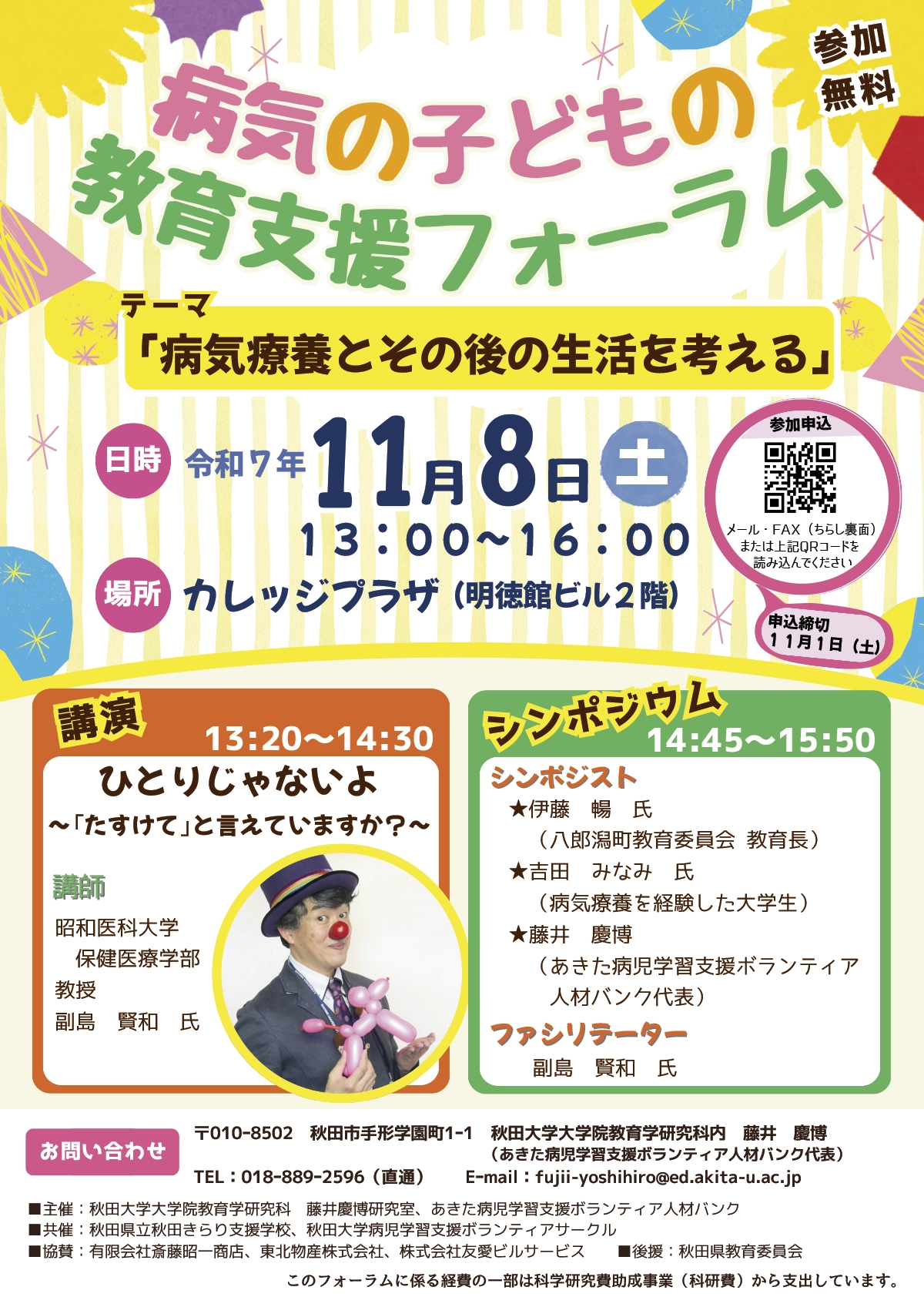 令和7年11月8日(土)に、カレッジプラザで「令和7年度 病気の子どもの教育支援フォーラム」を開催します。